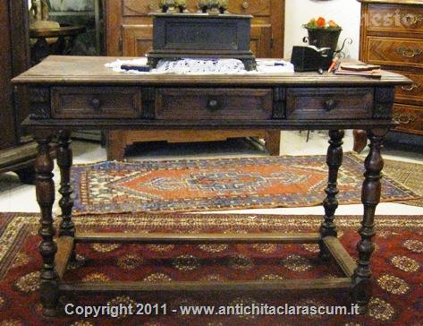 Descrizione:Tavolino rettangolare in noce con 4 gambe tornite. Tre cassettini frontali.