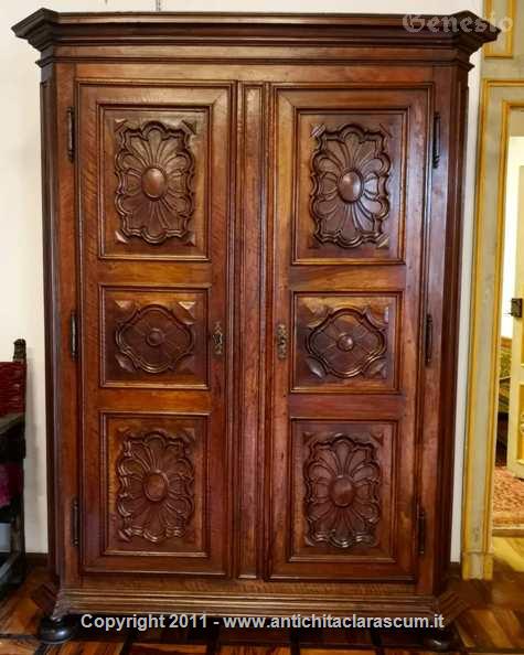 Descrizione:Armadio in noce scolpito sul fronte e sui fianchi.