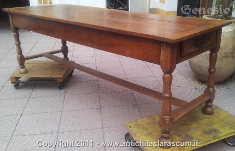 Descrizione:Tavolo rettangolare in ciliegio con 2 cassetti, gambe tornite.