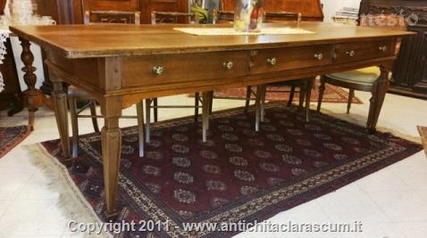 Descrizione:Grande tavolo in noce con tre cassetti. Gambe piramidali