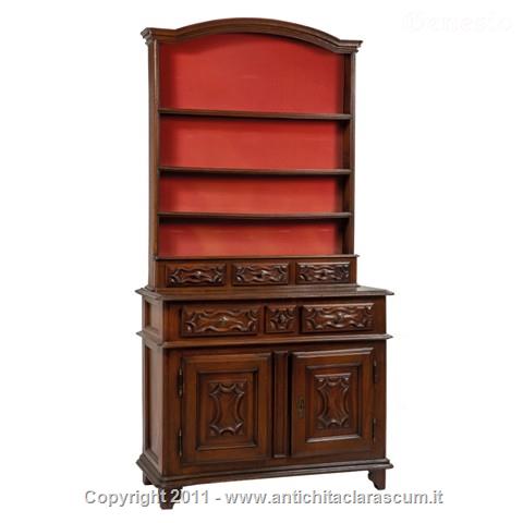 Credenza a due corpi. Parte inferiore a tre cassetti e due sportelli, alzata superiore con piani e tre cassetti.
