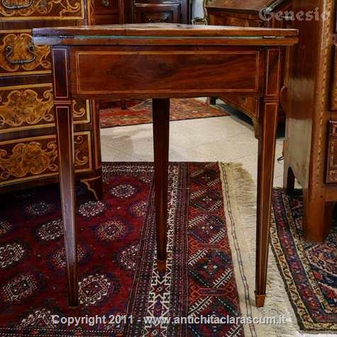 Descrizione:Tavolino Luigi XVI da gioco a base triangolare. In noce con intarsi a nastro.