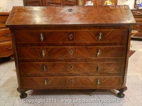 Descrizione:Cassettone a ribalta lastronato e intarsiato in ulivo.