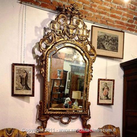 Descrizione:Specchiera dorata e intagliata con cimasa e vetri all'amalgama di mercurio.