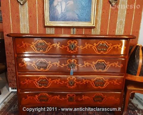 Descrizione:Cassettone in noce a quattro cassetti, intarsiato