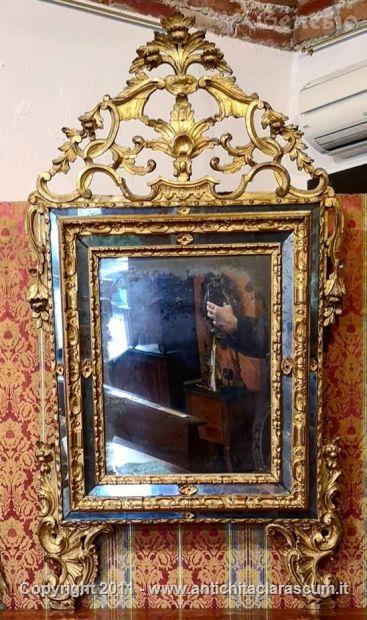 Specchiera scolpita e dorata con doppia cornice di specchi.